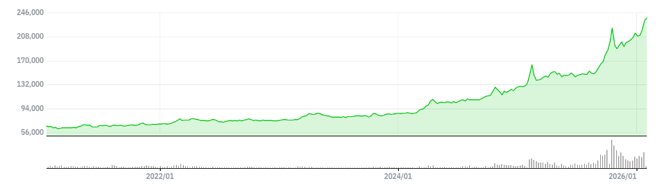 완만한 우상향이던 흐름이 2025년 말부터 급격한 상승 곡선을 그리며,